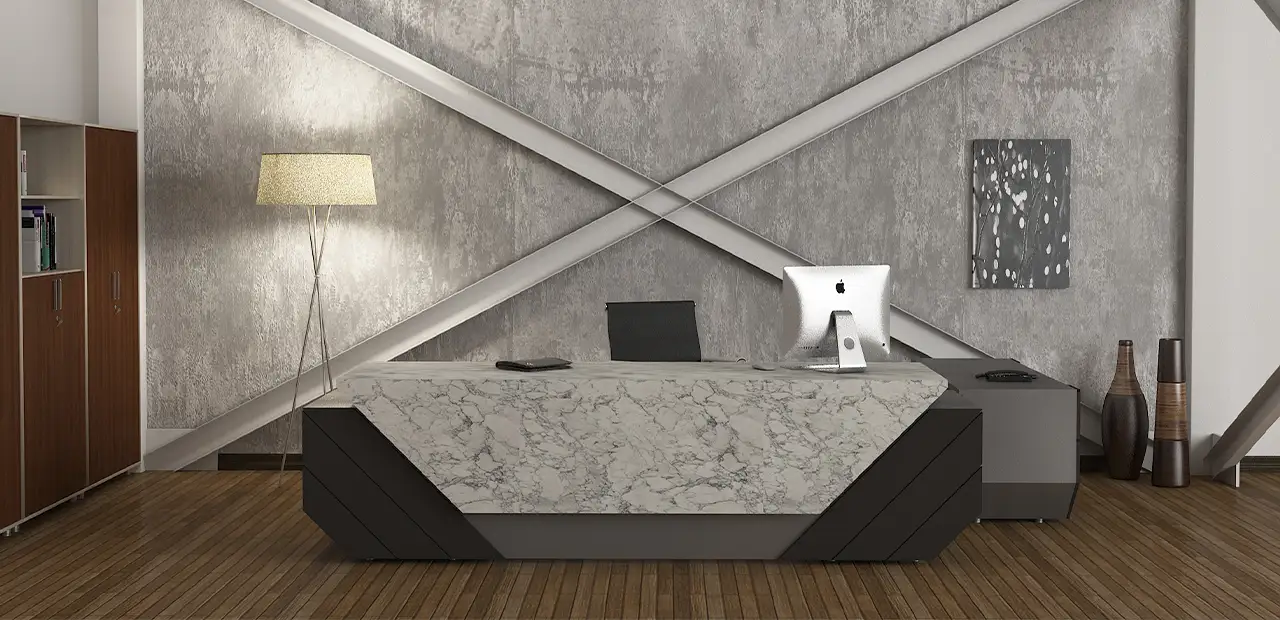 هنگام ورود به این بخش اولین چیزی که توجه را جلب میکند ، میز مدیریت است که با انتخاب مناسب آن میتوان تاثیر مثبتی در ذهن مراجعه کننده ایجاد کرد . میز مناسب در روحیه مدیران و کارمندان و ارتباط آنها با هم تاثیر زیادی دارد . باید توجه داشته باشید یک میز مدیریت مناسب ، میزی است که در همان نگاه اول جلوهای با شکوه داشته باشد . میز مدیریت هگزاگن کد 135L تنها برای یک نفر ساخته شده است و از دیگر ویژگیهای این میز شیک و کاربردی ، میتوان به جنس MDF آن اشاره کرد .