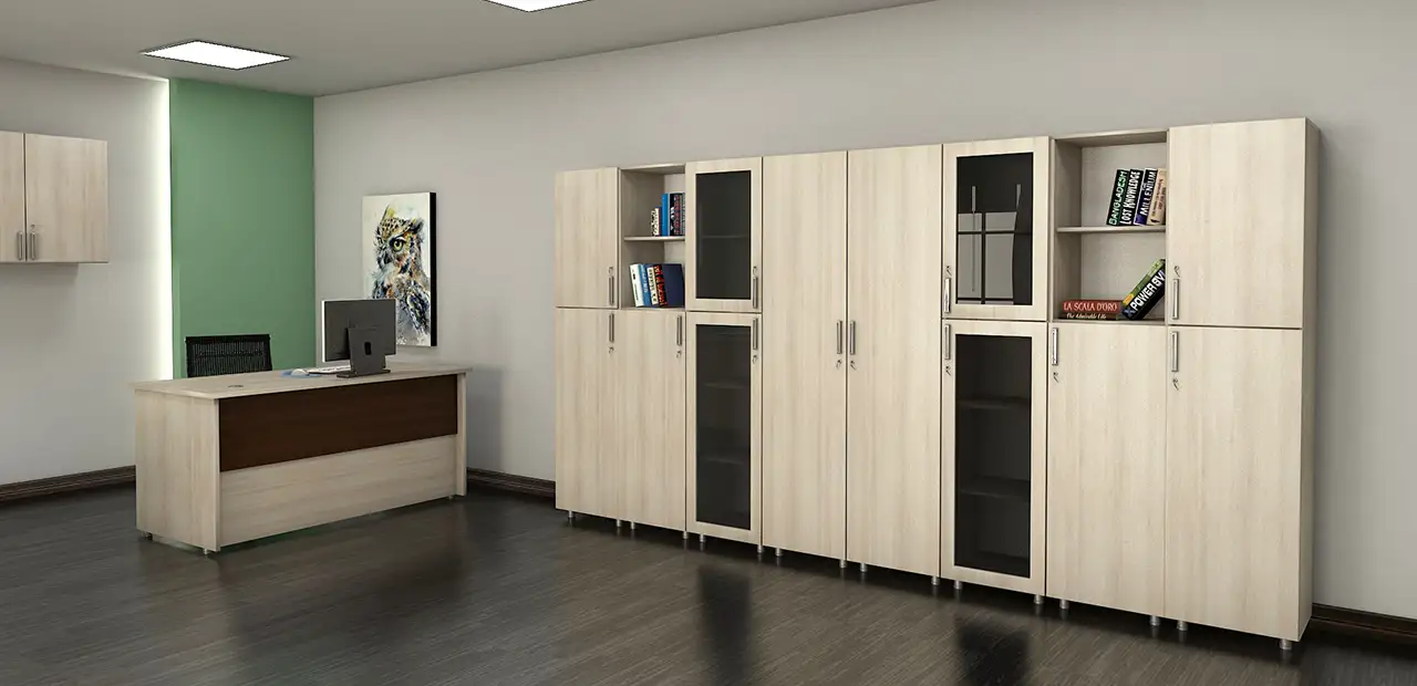 یکی از مهمترین لوازمی که در تمام محیطهای اداری ، شرکتها و به طور کلی در هر کسب و کاری لازم است کمد های بلند اداری است . نقش کمد به اندازه سایر تجهیزات اداری در محیطهای کاری مهم است و استفاده از آن ضرورت دارد و دسترسی را برای افراد آسانتر میکند . اولین خصوصیت مهمی که میخواهیم در مورد این کمدهای بلند مدست کد 45-1201 صحبت کنیم ، جنس MDF این محصول است . متریال MDF به معنای واقعی کلمه یک جنس همه کاره میباشد . این جنس بسیار سبک میباشد و به همین دلیل جابجایی آن راحت است .